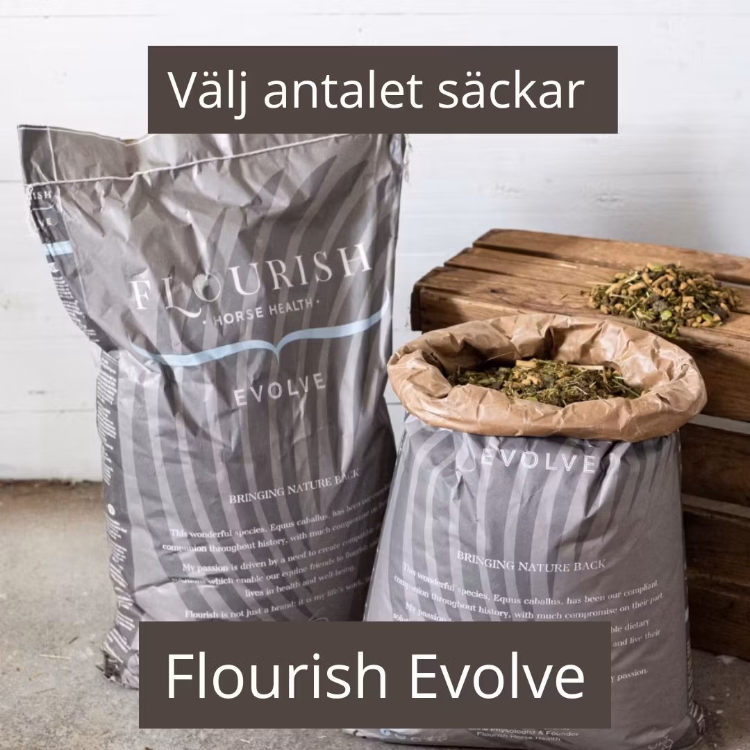 Flourish Evolve har utvecklats för att möta hästens utmaningar i modern tid. Idag har hästarna ett mer komplext näringsbehov med många som lider av metabola obalanser och mag-tarmproblem på grund av diet - och miljöstressorer. Därför har Linda Bennis utvecklat fodret för att hjälpa till att möta dessa behov genom att lägga till en skräddarsydd örtblandning, speciellt inriktad på mikrobiomet och tarmslemhinnan. Samtidigt som grunden i det sedan länge etablerade signaturfodret bibehålls.